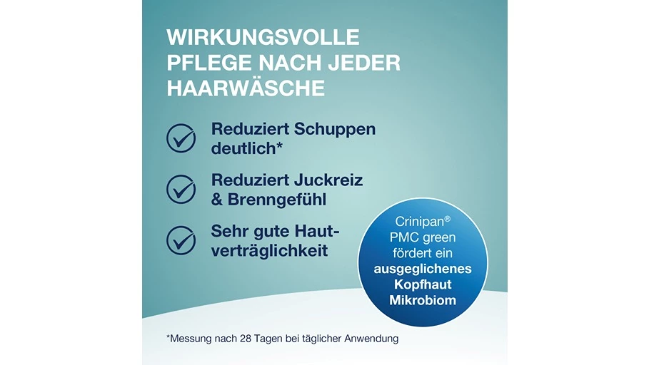 - Crinipan® PMC green reduziert den Hefepilz Malassezia furfur und fördert ein ausgeglichenes Kopfhautmikrobiom